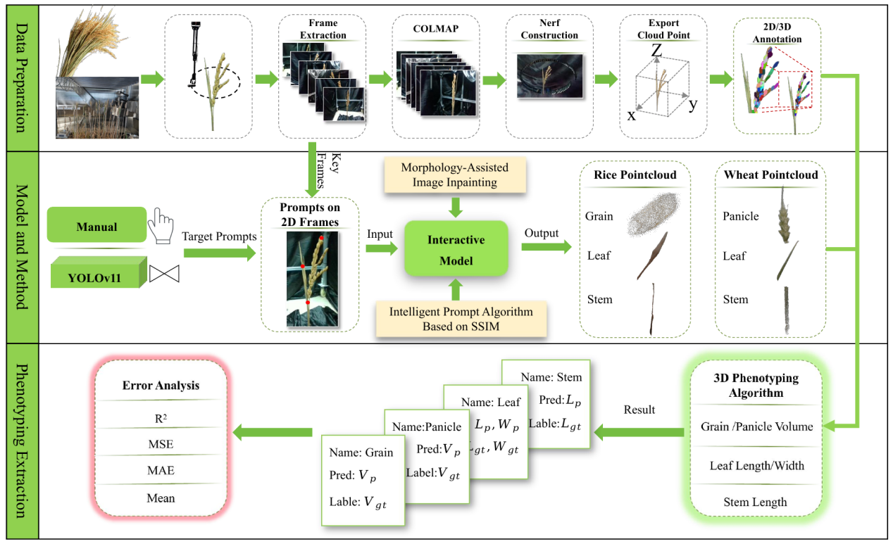 近期,中國科學院合肥物質院智能所黃河研究員團隊提出了一種基于神經輻射場(NeRF)與Segment Anything Model 2(SAM2)融合的交互式無監督植物快速表型提取框架IPENS,實現了對水稻和小麥等作物多器官的高精度三維點云提取,顯著提升了植物表型分析的效率與準確性。該研究成果已正式發表于植物表型學領域知名期刊Plant Phenomics(中國科學院一區TOP期刊)上。