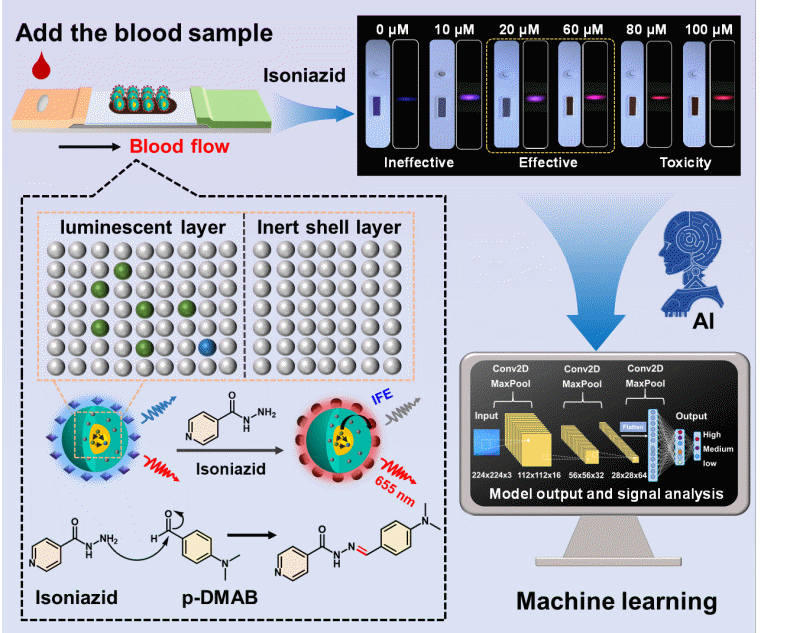 此外,研究團隊基于上轉換納米粒子(UCNPs)的結構精準調控,成功開發出一種可用于全血中藥濃度實時監測的智能傳感平臺。為解決傳統檢測方法在復雜血液基質中信號干擾強、操作繁瑣、無法實時監測的技術瓶頸難題,研究人員設計構筑了NaYF?:Yb,Tm@NaYF?核殼結構納米顆粒,有效抑制了表面淬滅效應,顯著提高了上轉換發光效率和光穩定性。通過將對二甲氨基苯甲醛(p-DMAB)和納米顆粒結合,構建出高特異性比率型熒光探針,在無需樣本預處理的情況下,實現了對抗結核藥物異煙肼的快速、高信噪比視覺化檢測。該平臺結合3D打印封裝、智能手機成像與卷積神經網絡(CNN)分析,實現了熒光信號與藥物濃度的自動精準映射,為藥物積累引起的肝毒性和神經病變個體化監測及臨床診斷提供了強有力的技術支撐。