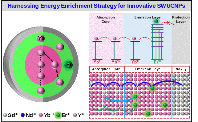 熒光傳感技術在食品質量控制及疾病輔助診斷等領域具有重要的應用前景。但傳統的上轉換納米粒子(UCNPs)中發光離子均勻摻雜的設計導致核心區離子無法有效淬滅,產生背景信號干擾。早期三明治結構雖通過限制發光層提升了LRET效率,卻犧牲了發光中心數量,從而限制了傳感靈敏度的提高。