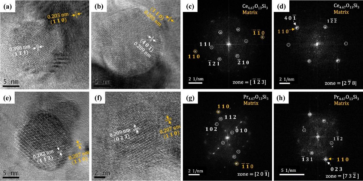 圖1納米顆粒與基體的界面關(guān)系:(a-d) Ce4.67O13Si3納米顆粒;(e-f) Pr4.67O13Si3納米顆粒