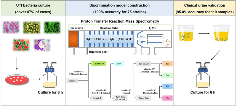 尿路感染作為最常見(jiàn)的感染性疾病之一,其診療效率高度依賴(lài)于病原菌的快速鑒別。目前臨床上常用的細(xì)菌鑒定流程通常需24小時(shí)以上,拖延了個(gè)性化治療方案的制訂,可能導(dǎo)致抗生素濫用和治療失敗。盡管人體生物樣本中的揮發(fā)性有機(jī)物已被用于感染性疾病的快速篩查,但由于受內(nèi)源性代謝物干擾以及細(xì)菌來(lái)源VOCs含量低等因素影響,直接從生物樣本中通過(guò)VOCs實(shí)現(xiàn)菌種鑒別仍面臨挑戰(zhàn)。