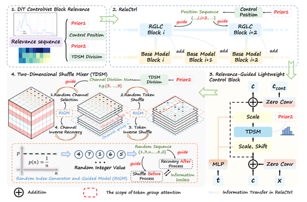 針對上述挑戰,研究團隊提出了相關性引導的高效可控生成框架 RelaCtrl,在不犧牲生成質量的前提下,以更加精煉、智能的方式將控制信號融入擴散變換器。該框架首先定義并計算“ControlNet相關性得分”,通過在推理階段逐層跳過控制分支,系統評估各層控制對最終圖像質量和控制精度的影響。基于這一度量,RelaCtrl 可自適應調整控制層的插入位置、參數規模與建模能力,有效削減冗余參數與重復計算,在控制能力與資源利用之間實現動態平衡。在結構設計上,團隊進一步以精心設計的二維隨機混合模塊(TDSM)替代傳統復制模塊中的自注意力機制和前饋網絡(FFN),構建高效的詞元混合器與通道混合器,在保持表達能力的同時大幅壓縮計算成本。實驗結果表明,與典型 ControlNet 方法相比,RelaCtrl 僅以約 15% 的參數量和計算復雜度即可獲得更優的生成表現,在多項定性與定量指標上均展現出顯著優勢。