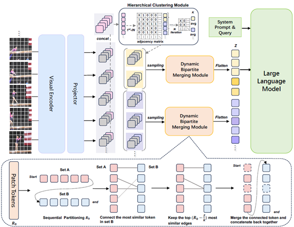 DYTO框架借鑒人腦處理視覺信息的核心機制,提出一種完全無需訓練的動態令牌合并方法。其突破在于通過“分層注意力選擇”與“自適應信息壓縮”兩大策略,在計算效率與語義理解之間實現高效平衡。DYTO可無縫接入現有圖像MLLMs,顯著提升零樣本視頻理解性能,并具備進一步強化已微調模型的潛力。該框架的技術創新主要體現在以下三個方面:首先,DYTO模擬人腦的對運動、高對比的信息的“選擇性注意力機制”,通過分層聚類分析視頻幀的語義表示(CLS令牌),自動識別并聚焦于關鍵事件片段,避免對冗余信息的均勻處理,實現高效的事件感知與時間結構建模。其次,受大腦信息壓縮與抽象記憶機制的啟發,DYTO采用動態二分圖令牌合并策略,依據每幀內容自適配地合并語義相近的視覺令牌,在減少計算負擔的同時,最大程度保留語義完整性,避免信息丟失與語義失真。最后,通過模仿大腦從局部到整體的認知過程,DYTO將分層聚類與令牌合并相結合,實現從幀級視覺特征到事件級語義結構的遞進式理解,增強對長視頻復雜內容的整體把握能力。