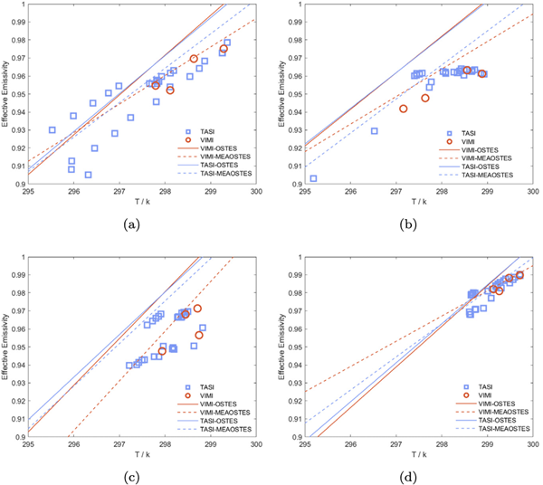 改進(jìn)結(jié)合算法對(duì)不同類型地表的發(fā)射率與離地亮溫?cái)M合曲線精確結(jié)果圖. (a)瀝青屋頂;(b)白云巖大理石;(c)棕色粉質(zhì)壤土;(d)草地