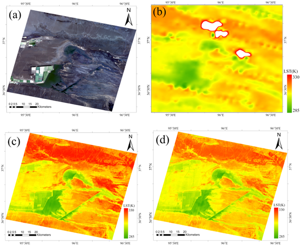 地表溫度檢索結(jié)果圖.(a) GF-5B真彩色合成圖像;(b)MODIS地表溫度產(chǎn)品結(jié)果;(c)溫度/發(fā)射率分離優(yōu)化平滑算法反演結(jié)果;(d) 改進(jìn)結(jié)合算法反演結(jié)果