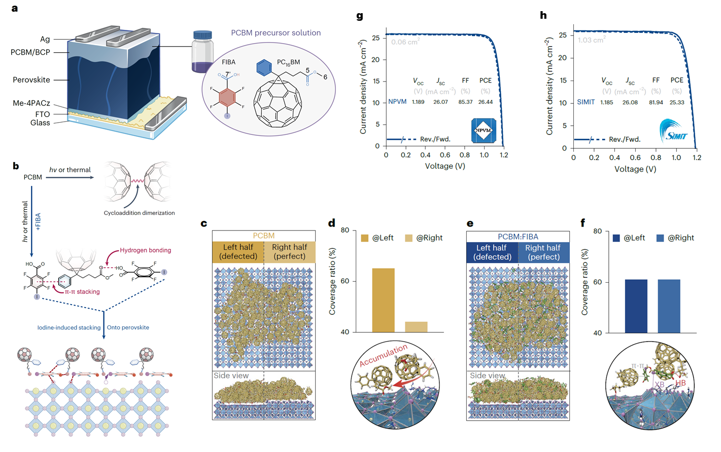 圖. (a)鈣鈦礦電池結構及添加劑分子示意圖;(b)PCBM電子傳輸材料二聚化及添加劑作用機理;(c-f)分子動力學模擬結果示意圖;(g-h)太陽電池器件效率。