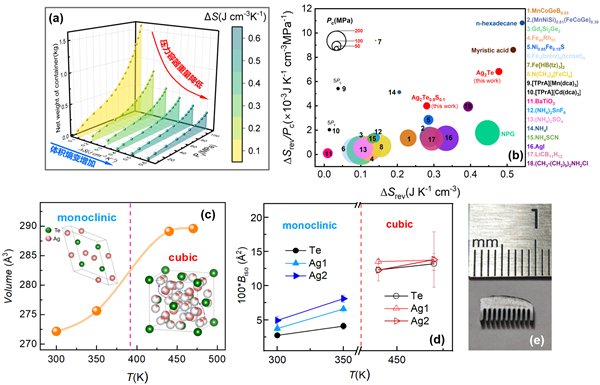 為解決這一難題,研究團隊研發了一種新型高密度Ag2Te1-xSx材料。研究表明,在僅70 MPa的中等驅動壓力下,該材料實現了0.478 J·cm-3·K-1的可逆體積熵變,刷新了當前無機壓卡材料的最高紀錄。其壓卡強度高達6.82 mJ·cm-3·K-1·MPa-1,不僅遠超多數已報道的無機壓卡材料,甚至優于新戊二醇等經典的有機龐壓卡材料。進一步研究表明,該材料巨大的體積壓卡效應源于壓力誘導的立方相至單斜相結構轉變(相變時晶格體積變化約為5.4%),以及相變過程中銀離子擴散動力學的顯著變化。值得一提的是,該材料體系還具備較高熱導率(2.02–2.28 W·m-1·K-1),有助于實現高效熱交換,進而提升制冷效率;同時,還顯示出良好塑性,可輕松加工成1毫米級小球或0.5毫米以下薄片;更重要的是,經過劇烈塑性變形、熱沖擊循環及反復壓力加載/卸載后,壓卡性能仍保持穩定,顯示出優異的服役可靠性。