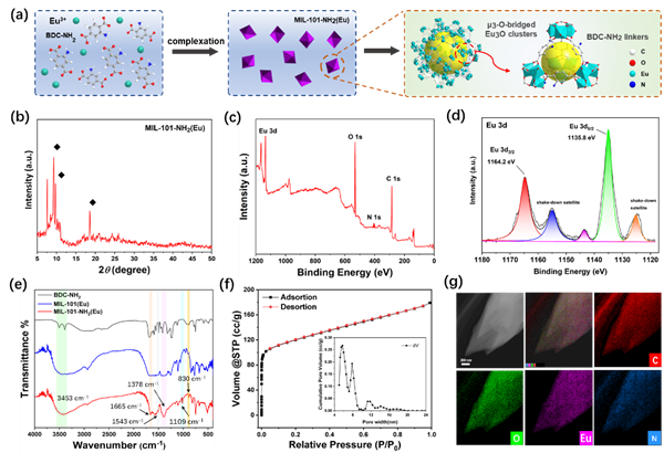 圖1.鑭系熒光MOF材料合成路線及表征