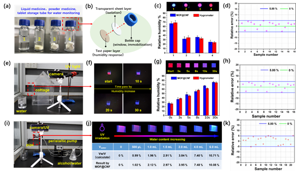 圖2. MOFs@纖維素熒光膜在固體藥物儲存、室內濕度監測及管道運輸中的應用展示