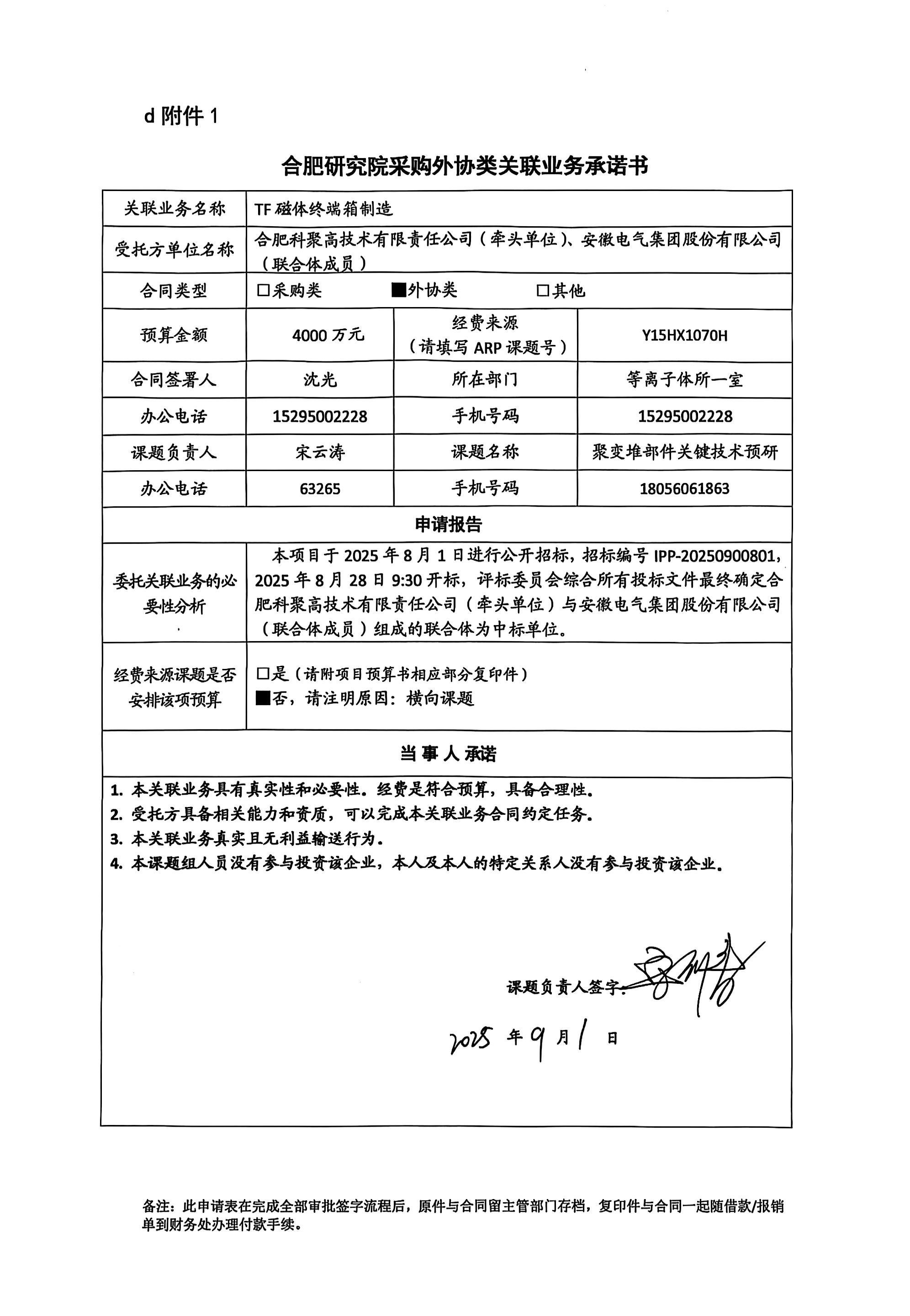 根據《中國科學院關于加強科研項目關聯業務管理的暫行規定》(科發條財字〔2015〕125號)、《中國科學院合肥物質科學研究院關于加強科研項目關聯業務管理的實施細則》(科合院發資字〔2021〕8號)、《合肥研究院加強關聯業務管理暫行辦法》(科合院發資字〔2022〕1號)、《合肥物質院加強關聯業務管理補充規定》(科合院發資字〔2025〕1號)要求,現就合肥科聚高技術有限責任責任公司作為牽頭單位,承擔我單位TF磁體終端箱制造進行關聯業務公示。