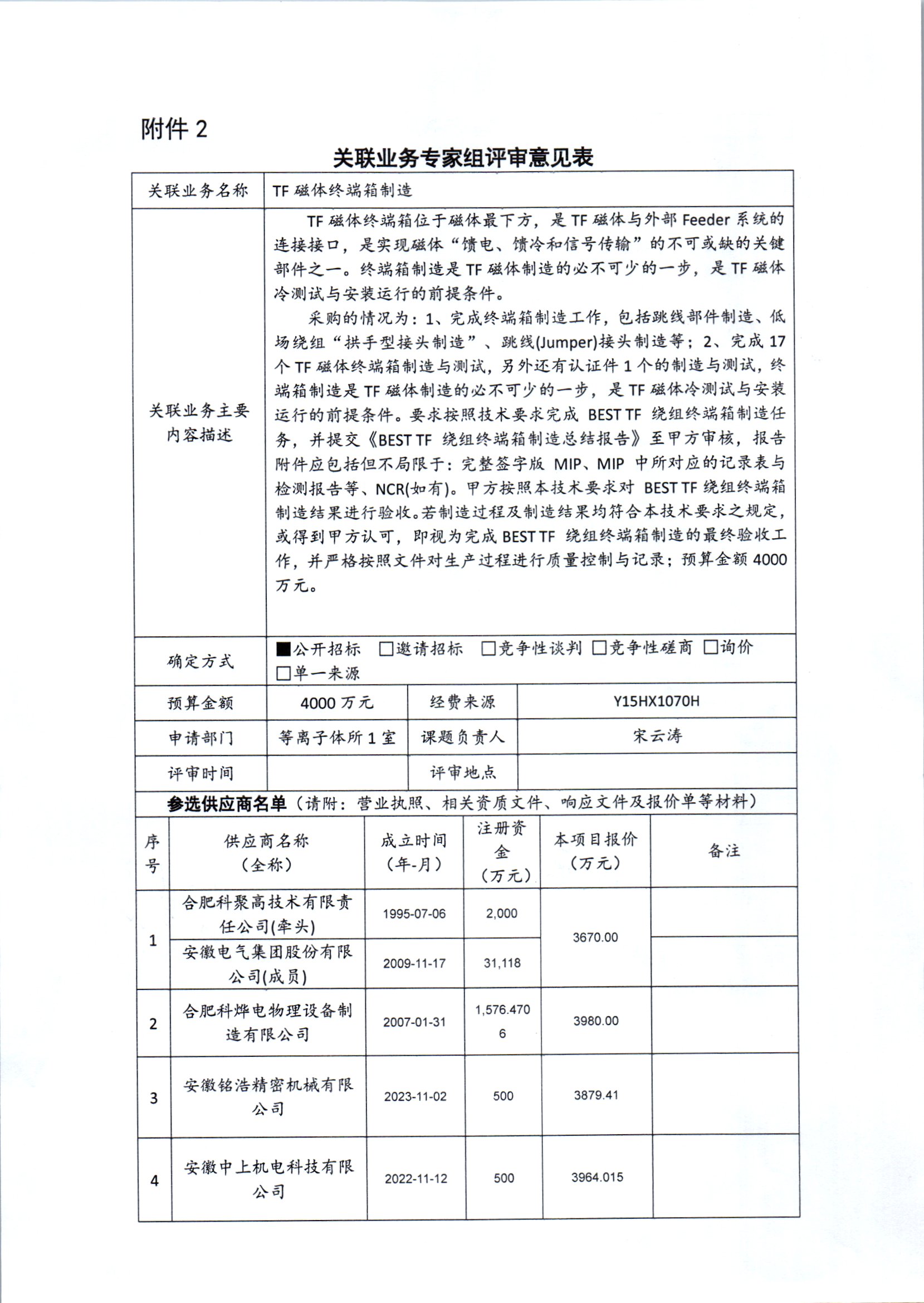????中國科學院合肥物質科學研究院等離子體物理研究所宋云濤老師委托合肥科聚高技術有限責任公司進行TF磁體終端箱制造。TF磁體終端箱位于磁體最下方,是TF磁體與外部Feeder系統的連接接口,是實現磁體“饋電、饋冷和信號傳輸”的不可或缺的關鍵部件之一。終端箱制造是TF磁體制造的必不可少的一步,是TF磁體冷測試與安裝運行的前提條件。合肥科聚高技術有限責任公司自然人股東包括合肥科學島控股有限公司,持股比例100%,本次采購構成關聯業務交易。