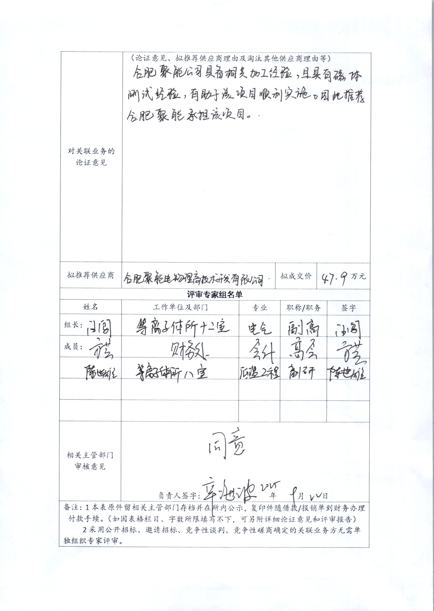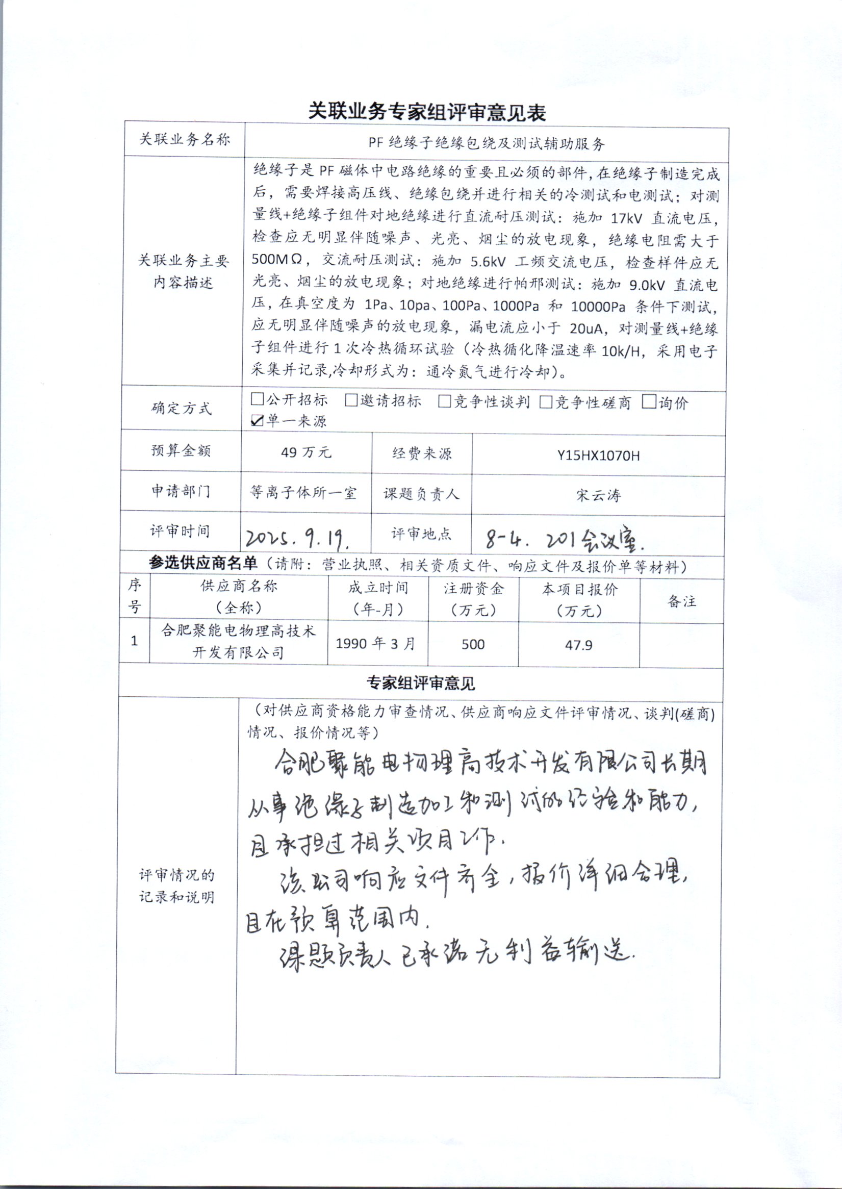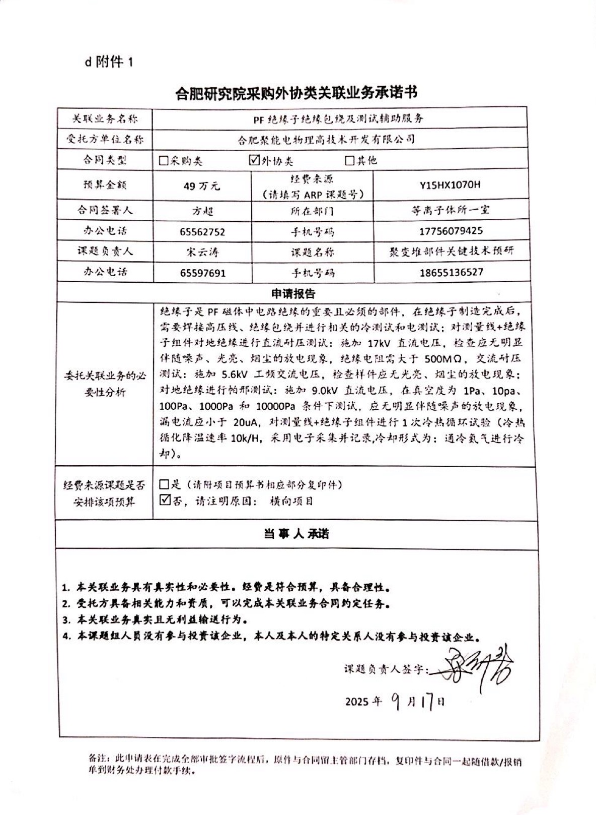 根據《中國科學院關于加強科研項目關聯業務管理的暫行規定》(科發條財字〔2015〕125號)、《中國科學院合肥物質科學研究院關于加強科研項目關聯業務管理的實施細則》(科合院發資字〔2021〕8號)、《合肥研究院加強關聯業務管理暫行辦法》(科合院發資字〔2022〕 1號)、《合肥物質院加強關聯業務管理補充規定》(科合院發資字〔2025〕1號)要求,現就我院委托合肥聚能電物理高技術開發有限公司進行PF絕緣子絕緣包繞及測試輔助服務的關聯業務做公示。